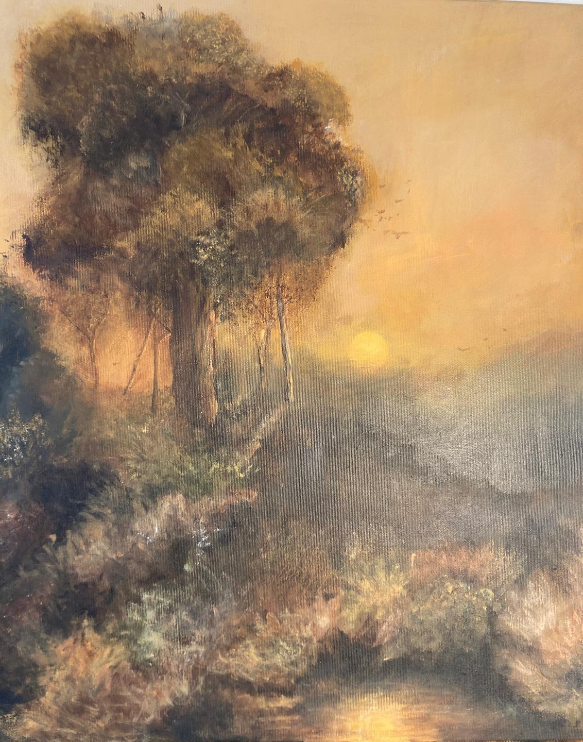 Escena onírica de un crepúsculo otoñal donde la luz y la calma se funden.