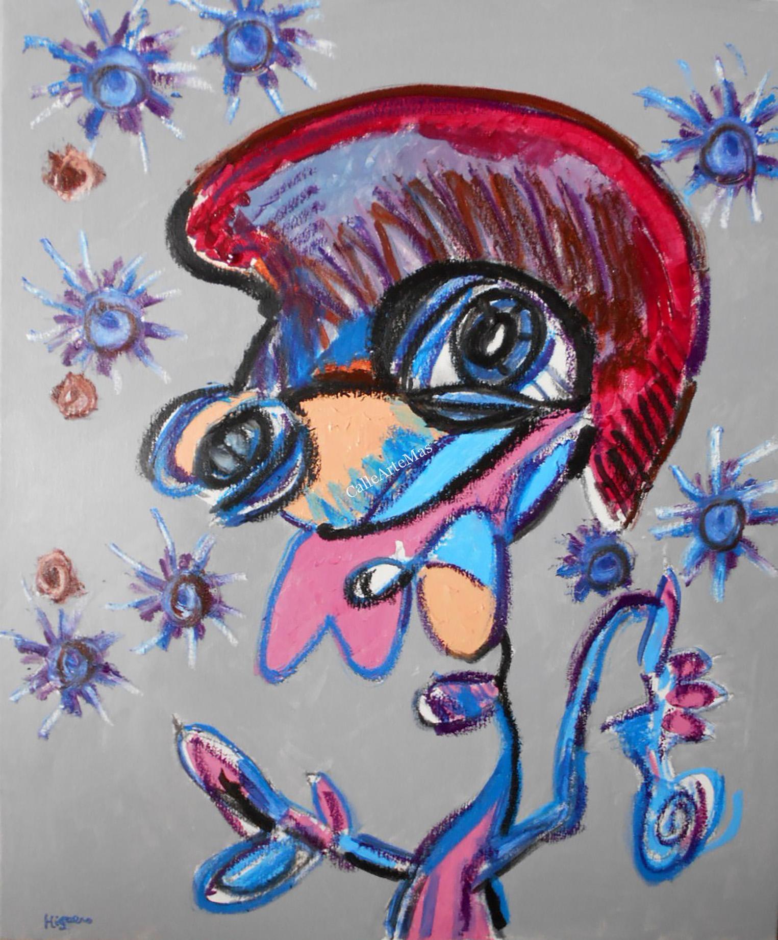 Pintura al Acrílico y Oilstick sobre lienzo de medidas de 65 x 54 cm de estilo Neoexpresionista, Artbrut y Outsider art, dentro del Arte Contemporáneo, que refleja a un personaje inventado que es un enfermo mental y que, en uno de sus delirios, ve estrellas girando a su alrededor. Inspirada en las obras de Picasso y Jean-Michel Basquiat.