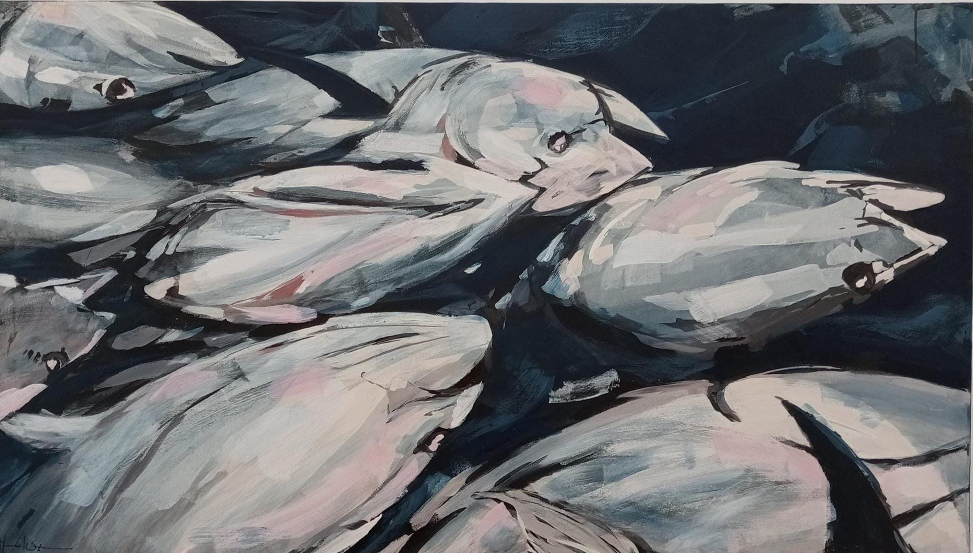 En el copo, es una obra que representa los atunes rojos de almadraba ahogándose en el copo. Los atunes cuándo se están ahogando por falta de agua, lo hacen boca arriba.