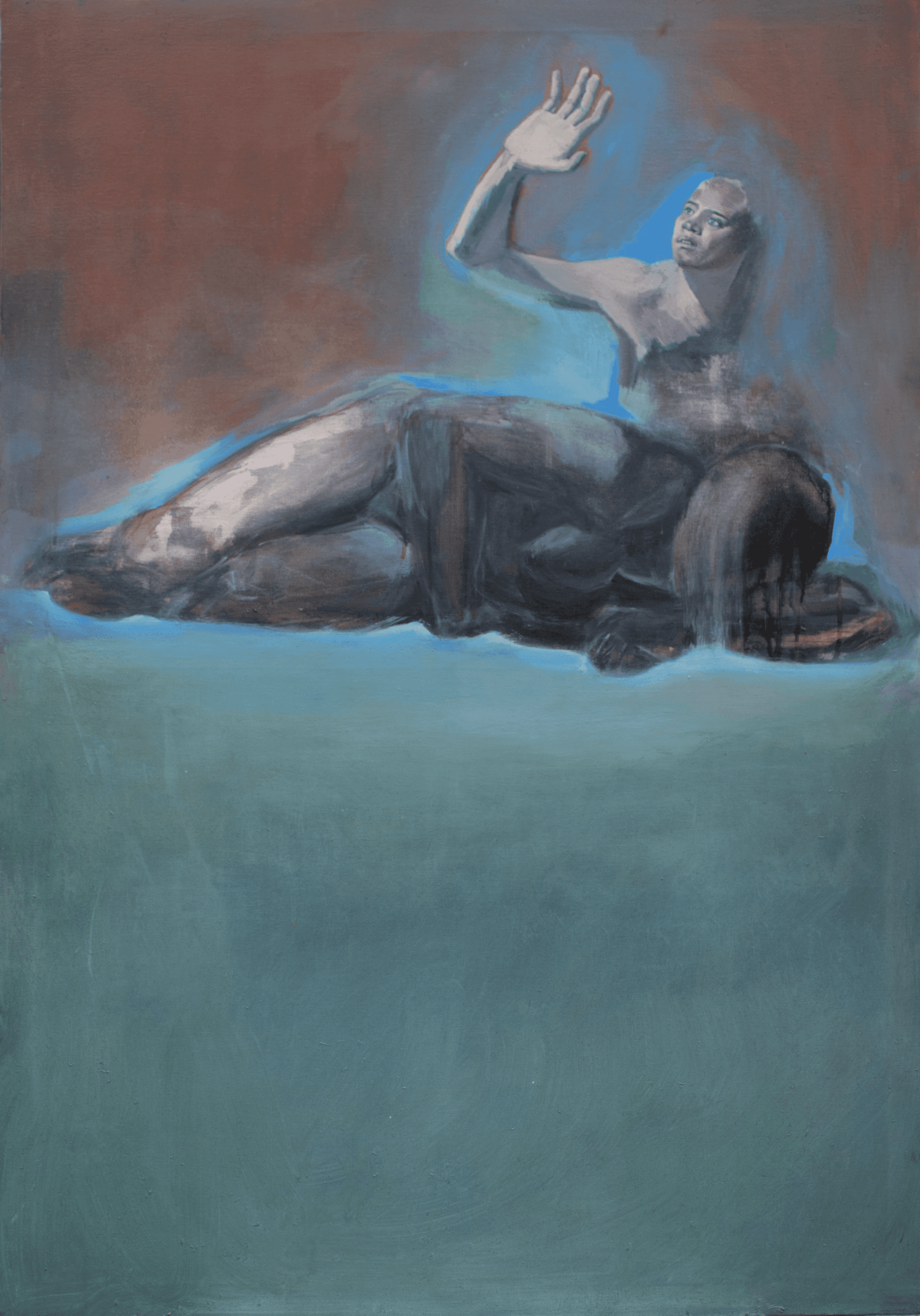 En la obra podemos observar dos figuras que estan intimamente relacionadas, la que está tumbada está realizada con carboncillo tratado con medium oleo dándole este aspecto dibujístico académico. La otra figura, más mística, está en dialogo con una luz que parece amenazar a la figura tumbada. El cuadro representa un instante de una narrativa que podemos imaginar y acabar de construir.
