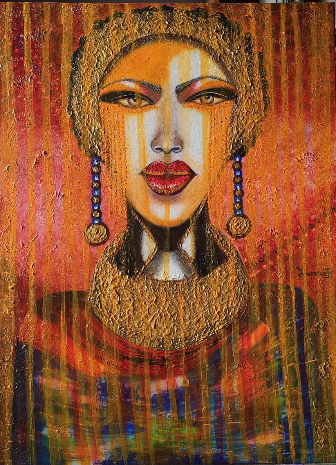 The work is inspired by the magical moment when the sunset and the moon meet over the Egyptian dunes. The golden tones of the sun and the moon’s silvery glow transform the landscape into a play of light and shadow. It is a scene that connects the warmth of the day with the calm of the night.
