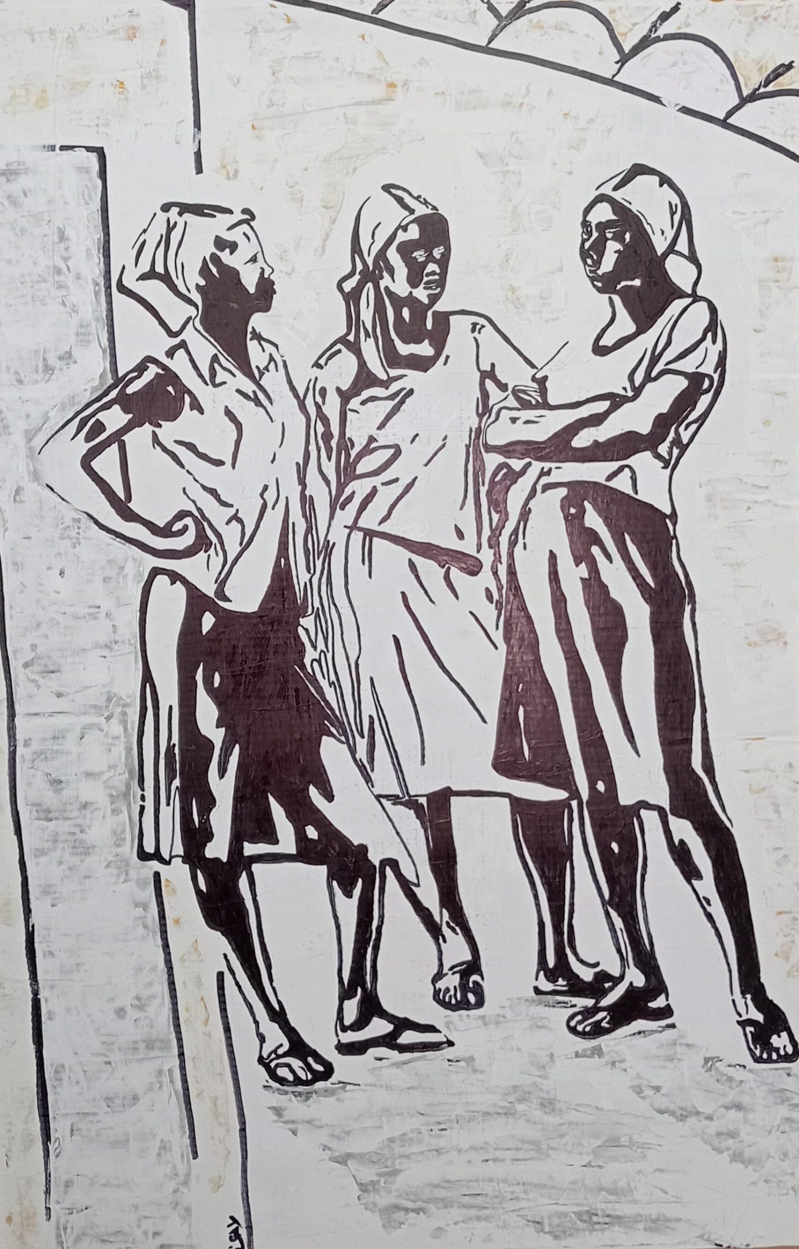 Tres mujeres conversan en calma en un patio africano, evocando la calidez y la sabiduría compartida en los hogares de Angola. La escena es un homenaje a la vida cotidiana, al tiempo detenido y a la fuerza silenciosa de lo femenino en la tradición africana.