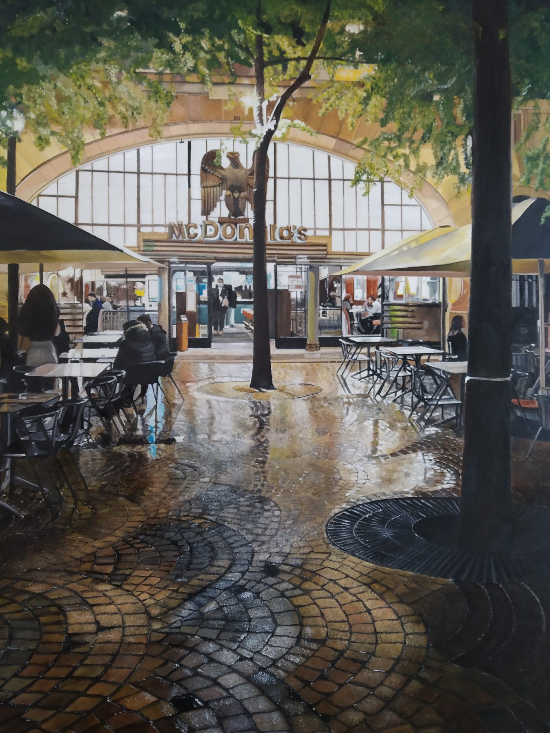Após confinamento, quis registar na tela a emoção da primeira saída à rua. Todos os receios e esperança no futuro.