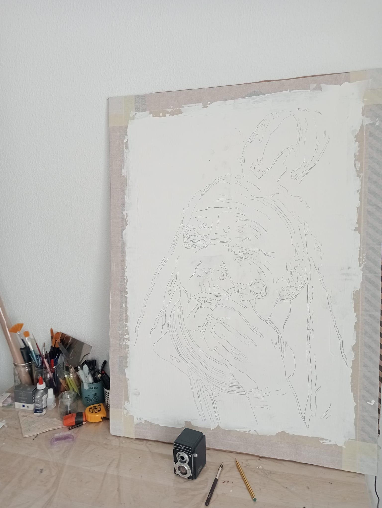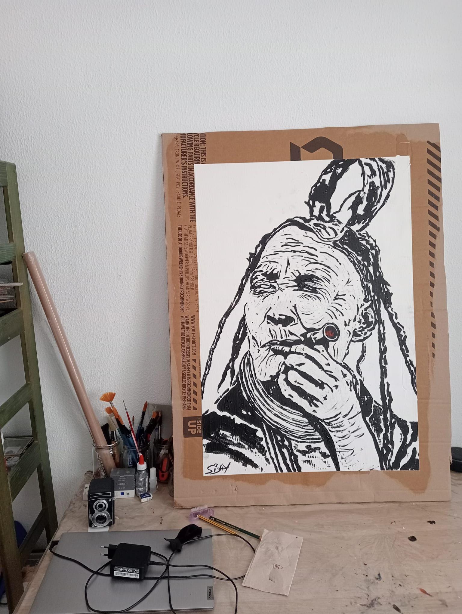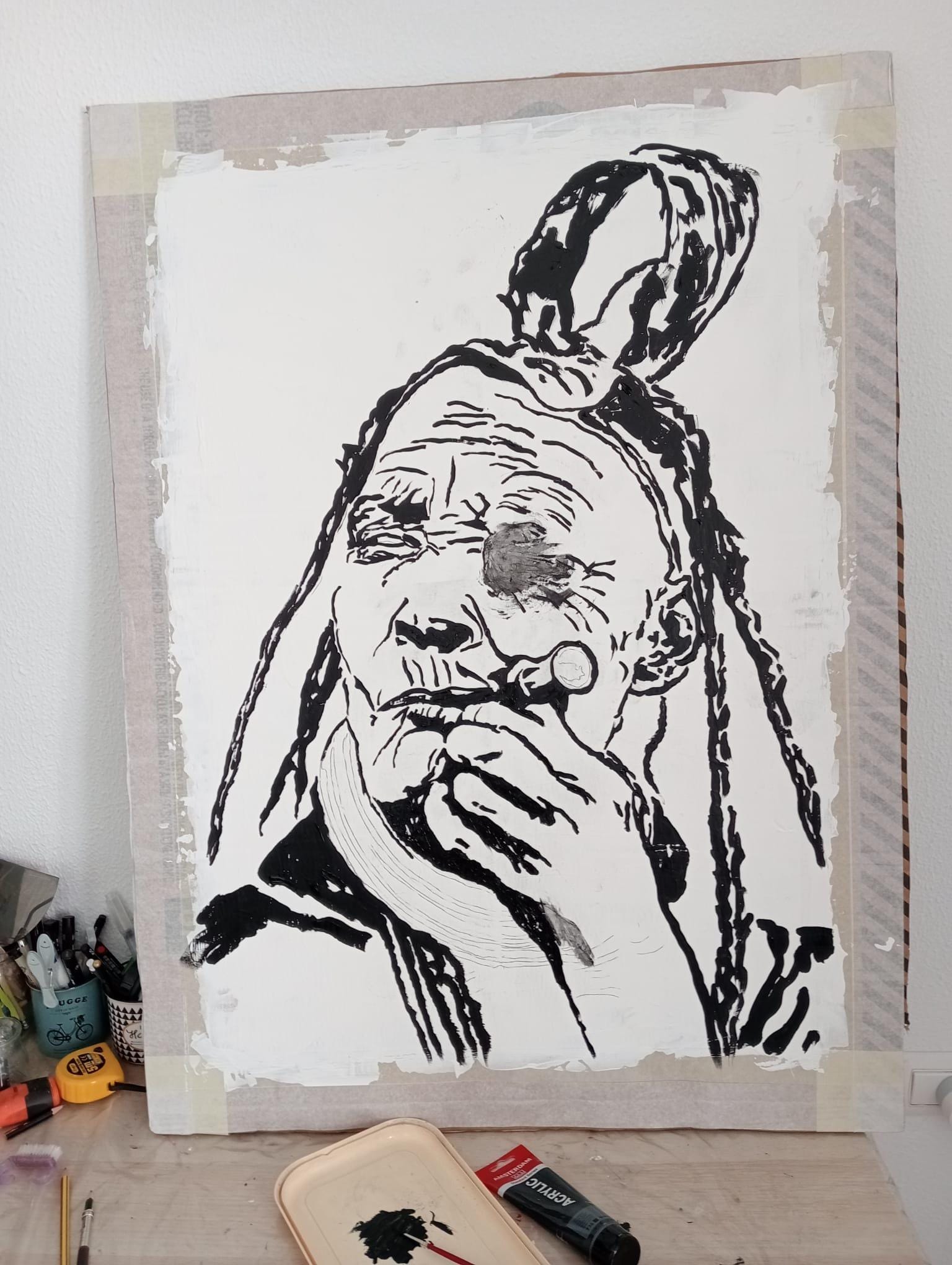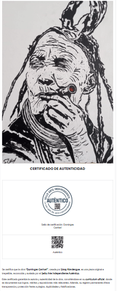 La obra se ejecuta sobre una base de gesso que aporta textura y profundidad al trazo, mientras que el soporte reciclado transmite un mensaje ecológico y social. Cada línea vibra con fuerza, revelando la historia escrita en los surcos de la piel de Domingas y el gesto firme con que sostiene su pipa. El punto de color rojo en el extremo del instrumento evoca la llama interna que no se apaga.