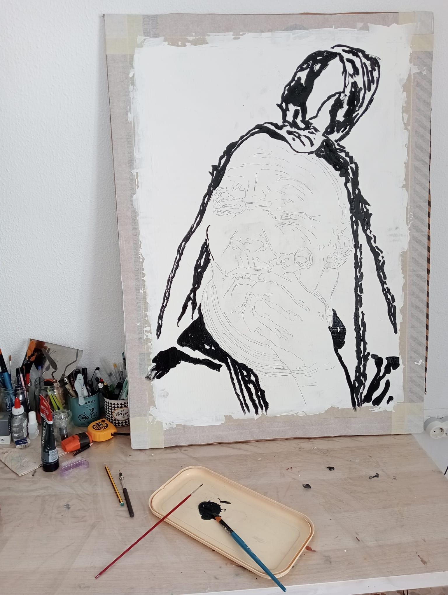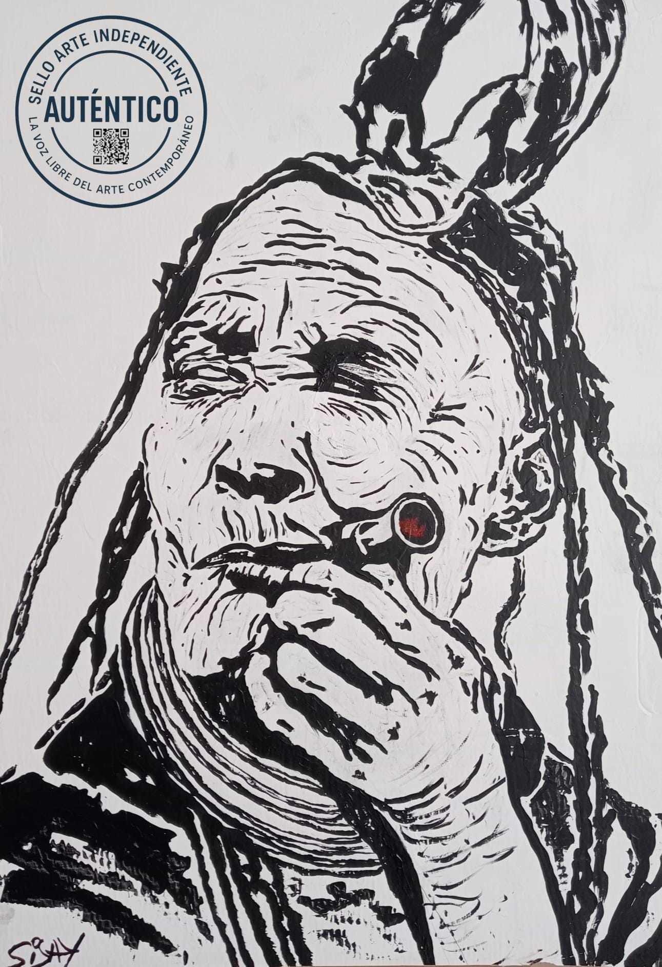 Domingas Canharí, conocida como la loca, es mucho más que un rostro: es memoria, resistencia y sabiduría marginal. Este retrato crudo y expresivo, realizado con tinta acrílica sobre cartón reciclado, captura la intensidad de una mujer que desafió los límites de su tiempo, entre la locura impuesta y la libertad conquistada.
