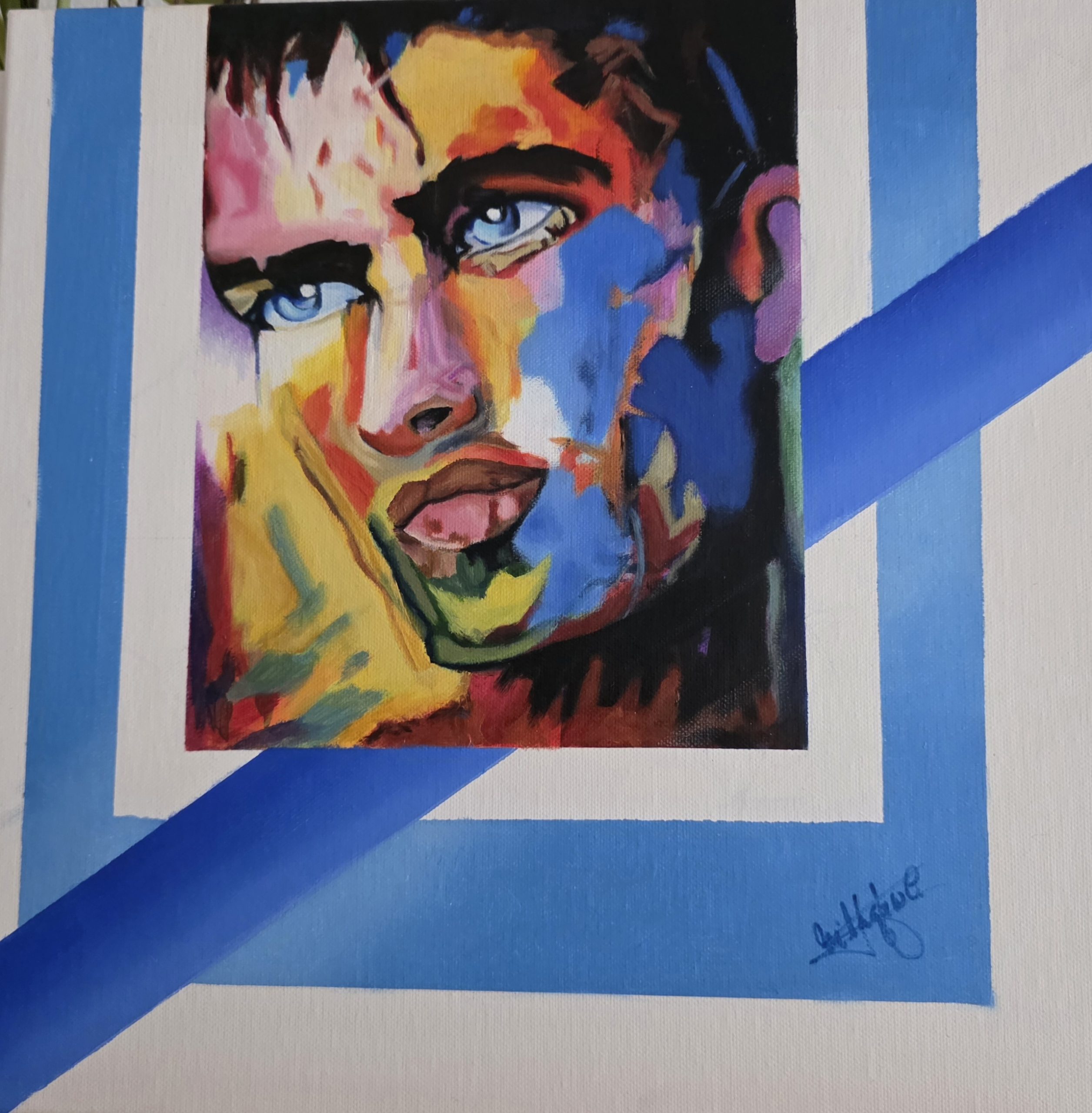 El marco geométrico en tonos azules que rodean el retrato aporta equilibrio y modernidad, reforzando la sensación profunda y haciendo que el rostro destaque aun mas.