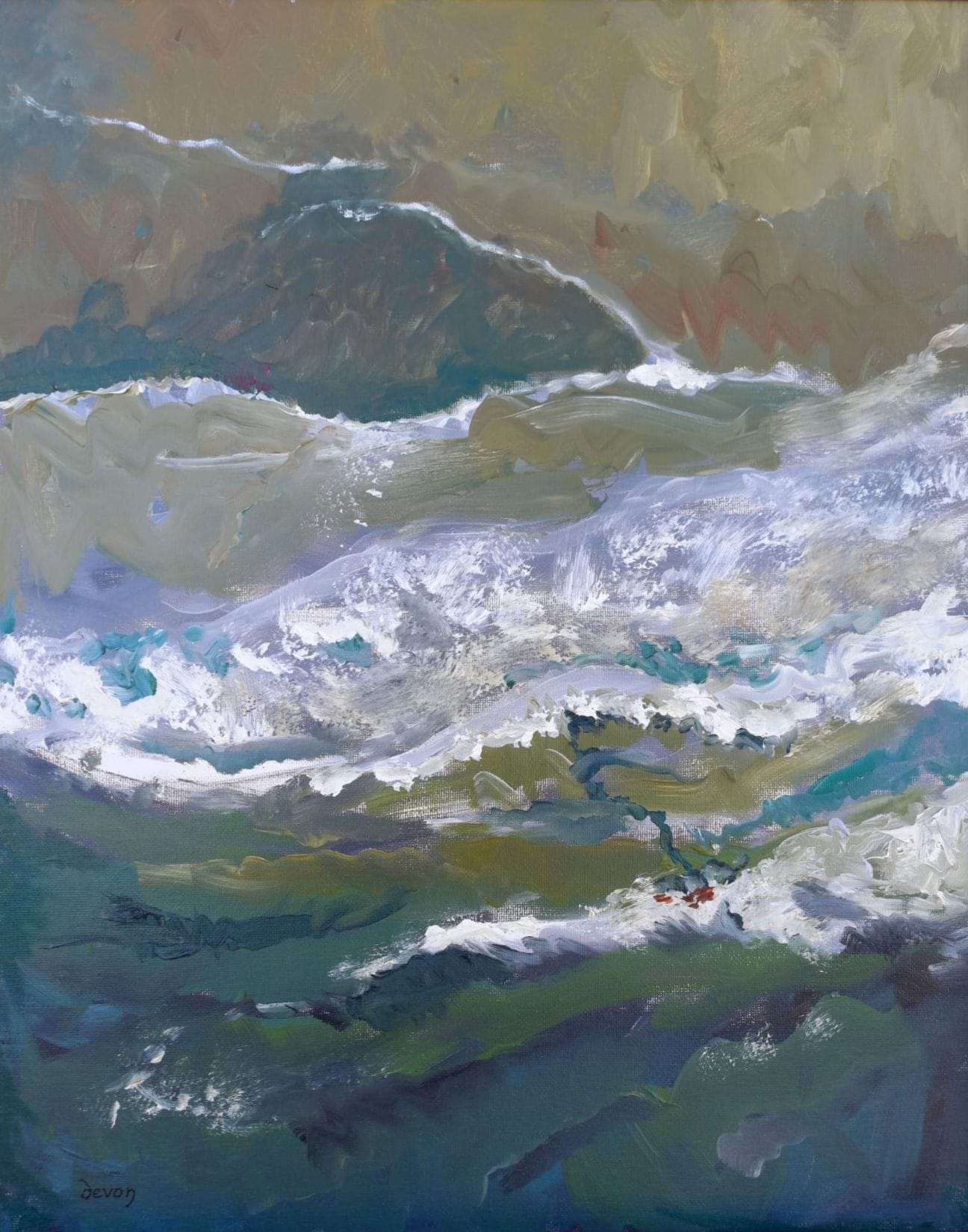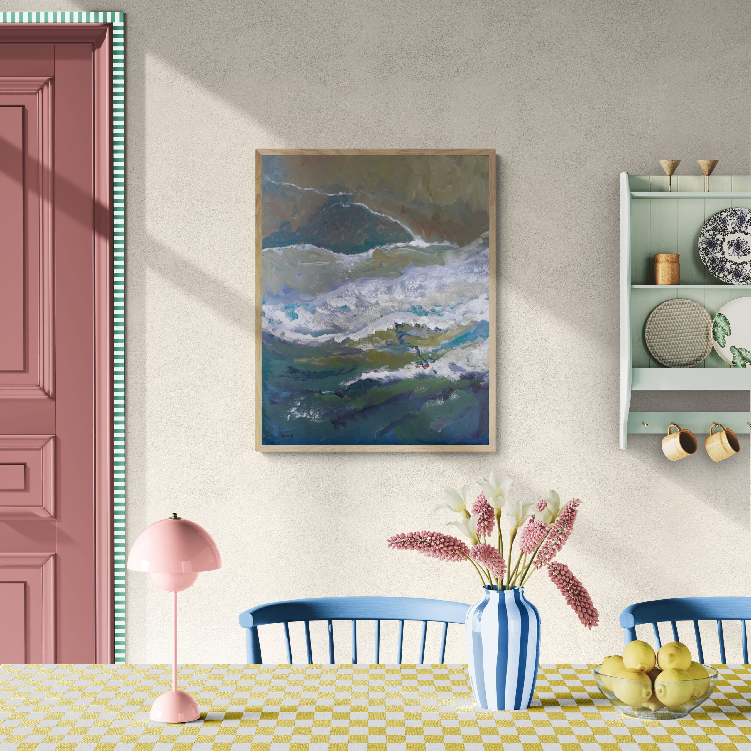 La energía indómita de la naturaleza se captura en esta creación, presentando la esencia de un mar turbulento a través de pinceladas fluidas y capas texturizadas. Movimientos amplios ilustran la espuma blanca sobre verdes profundos y tonos apagados, evocando olas que rompen contra una costa escarpada. Esta obra desafía las representaciones convencionales de la tranquilidad, reflexionando sobre las fuerzas impredecibles del entorno. Al sumergir al espectador en esta escena turbulenta, ofrece una experiencia que resuena más allá de lo visual, invitando a casi oír el rugido del océano. Existiendo en la intersección del caos y la belleza, suscita una reflexión más profunda sobre el mundo natural.