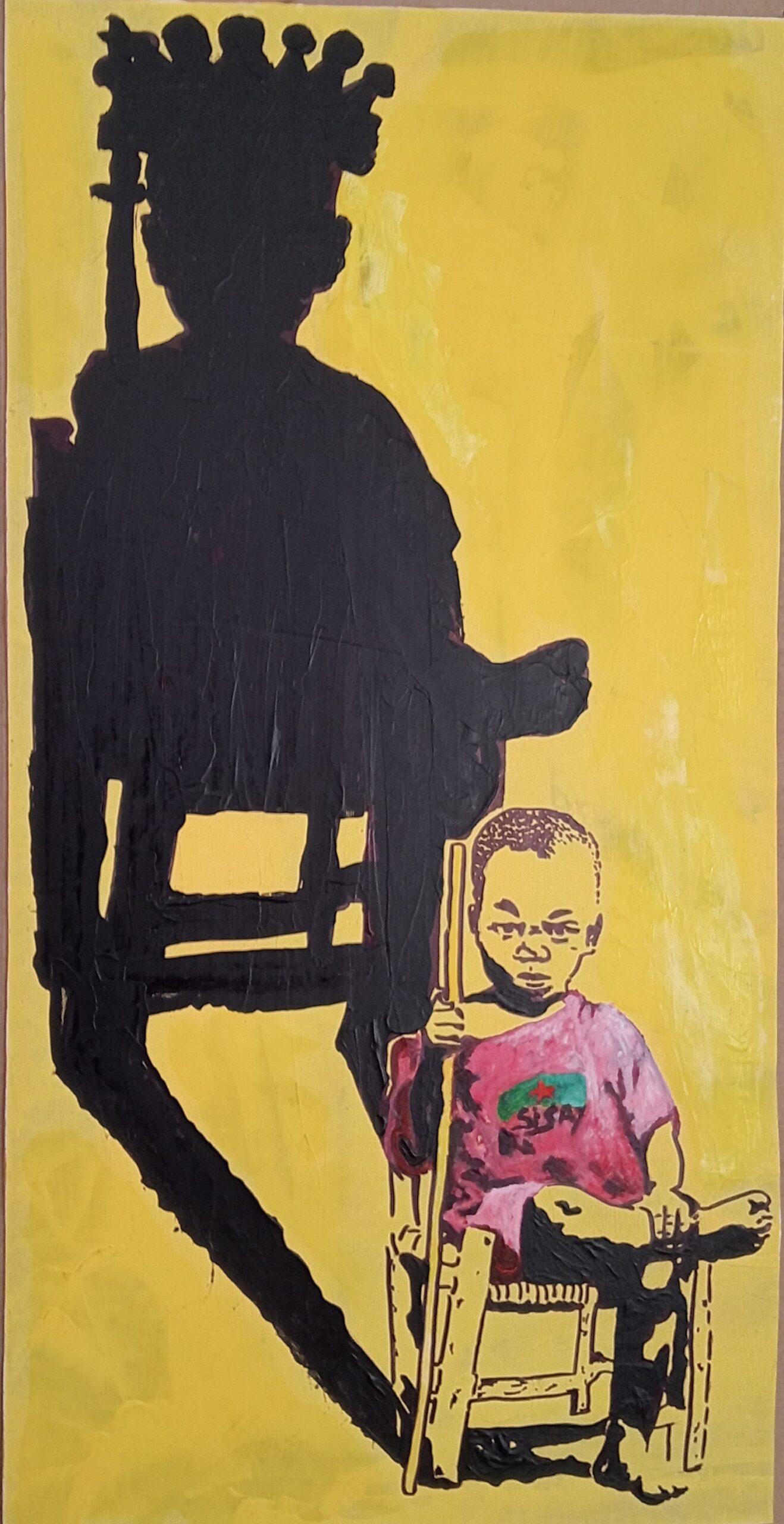 Yeso, tinta y acrílico sobre cartón reciclado, 40×60 cm. Juego de luz y sombra que evoca identidad y destino.