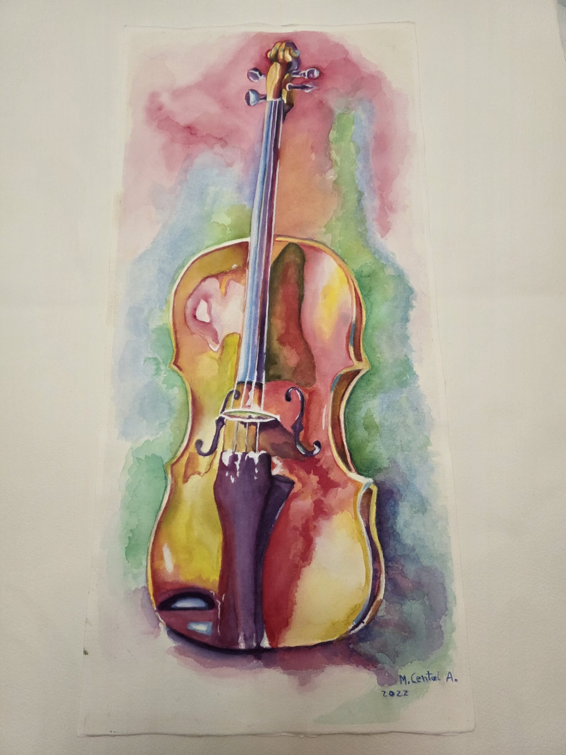 La composición vertical estiliza la figura del violín, guiando la mirada desde su base hasta el clavijero, mientras los reflejos y contrastes resaltan sus curvas elegantes.Es una pieza que trasmite armonia, creatividad y emoción ideal para amantes de la musica, el arte conteporanio o para quienes buscan un punto focal lleno de energía y color en cualquier espacio.